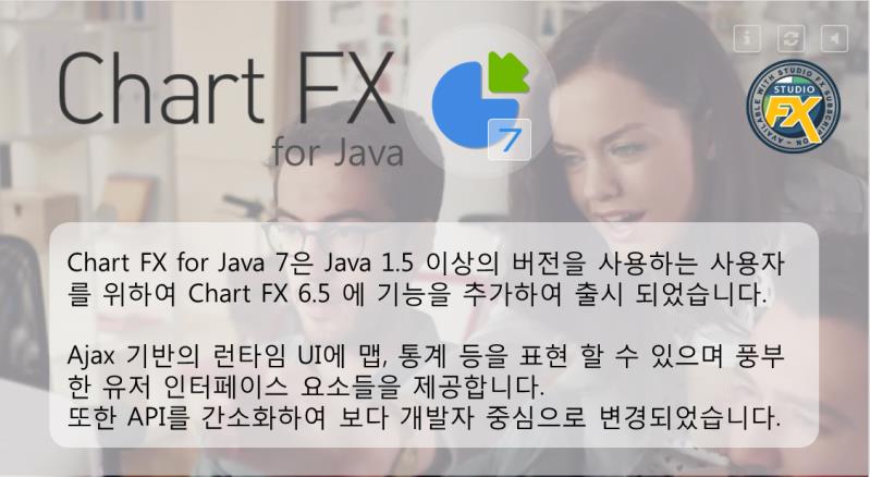 Chart FX 7 for Java Server는 Chart FX 6.5 for Java 엔터프라이즈 수준의 기술 기반을 구축하고 있습니다. 현재 JSF에 대한 지원이 추가 되었으며 Framework에 독립적인 Ajax 기반의 Runtime UI 에 Zero footprint 환경이나 Plug-in 요구 사항을 가진 조건에도 풍부한 사용자 인터페이스 요소를 제공할 수 있습니다.