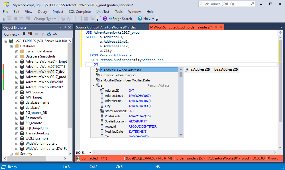 Easily write, beautify, and refactor your code and dramatically boost your productivity with the help of smart IntelliSense-style SQL code completion, great collection of code snippets, SSMS tab coloring & document sessions, intelligent renaming of aliases and variables, advanced customizable code formatting profiles, fatal execution warning reminder, result grid aggregates and data visualizer, and many other powerful features.