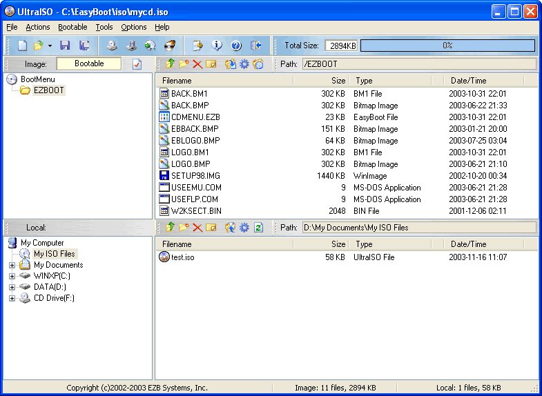 ⊙UltraISO uses the double window unification user contact interface, you have the choice to only use the quick buttons and/or the mouse Drag & Drops, you can handle any CD/DVD image file easily.
