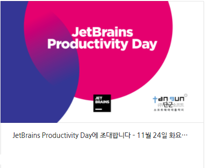 안녕하세요. JetBrains 한국 총판 단군소프트입니다. 지난 11월 24일, JetBrains Productivity Day에 참석해주신 분들께 감사드리며, 이번 행사를 통해 생산성 향상을 위한 다양한 팁을 알아가실 수 있는 즐거운 시간 보내셨길 바랍니다!