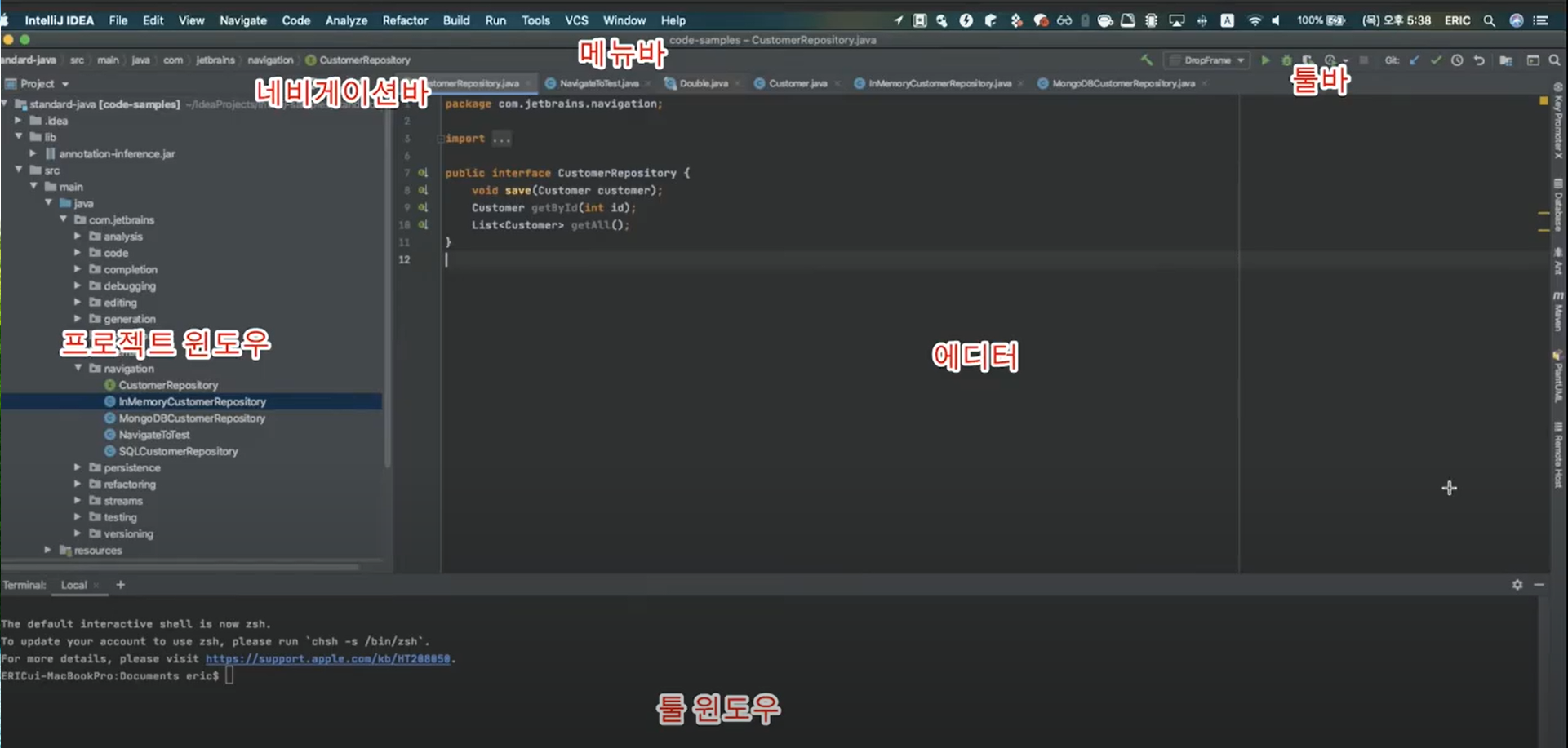 [IntelliJ 사용자 인터페이스] -메뉴바: IntelliJ에서 제공하는 모든 기능을 사용하실 수 있습니다. -네비게이션바: 현재 작업하고 있는 폴더나 파일의 계층구조를 보여줍니다. -툴바: 실행, 컴파일 등의 작업을 실행할 수 있는 실행 버튼이 배치되어 있습니다. -프로젝트 윈도우: 프로젝트의 폴더와 파일 계층 구조를 확인할 수 있습니다. -에디터 윈도우: 프로젝터를 편집할 수 있습니다. -툴 윈도우: 빌드 로그를 확인하거나 터미널, VCS 등의 작업을 진행할 수 있습니다.