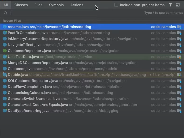 -⌘+All / Ctrl+All : 클래스 검색으로 바로 이동 -⌘+⇧+All / Ctrl+Shift+All : 파일 검색으로 이동 -⌘+Alt+All / Ctrl+Alt+All : 심볼 검색으로 이동 -⌘+⇧+A / Ctrl+Shift+A : Actions 검색으로 이동 -⌘+⇧+E / Ctrl+Shift+E : 최근 검색한 파일 목록으로 이동