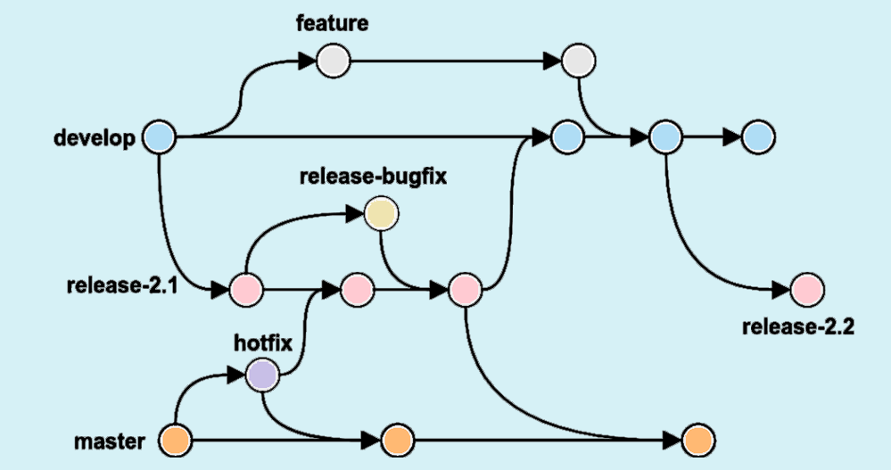 ◆ Master 브랜치: 언제든지 제품으로 출시될 수 있는 기본이 되는 브랜치 ◆ Develop 브랜치: Master 브랜치에서 시작된 브랜치로 기능을 추가할 때 사용하는 브랜치 ◆ Feature 브랜치: 기능을 개발할 때 사용하는 브랜치 ◆ Release 브랜치: 출시 버전이 될 브랜치 ◆ Hotfix 브랜치: 출시된 브랜치에서 수정이 필요할 때 사용하는 브랜치