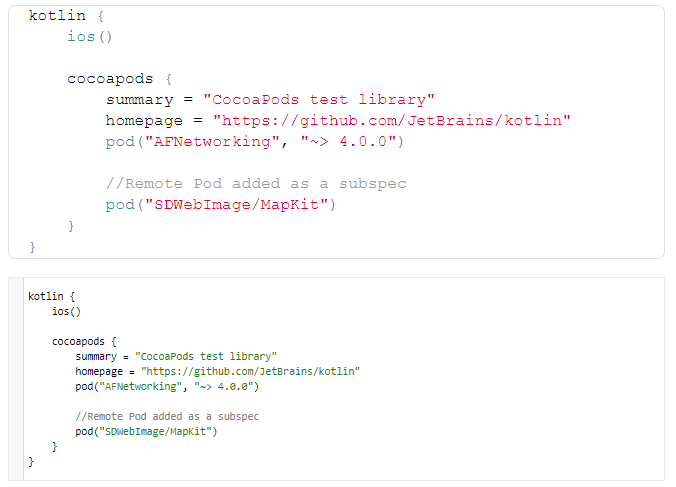 아래에서 CocoaPods 저장소의 Pod 라이브러리에 종속 요소를 추가하는 방법을 확인할 수 있습니다. Kotlin 1.4 문서는 모든 시나리오를 지원합니다.