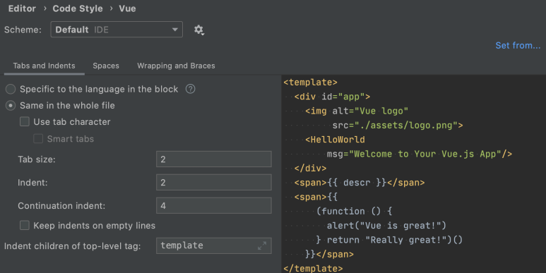 Vue 코드 내 보간의 서식도 변경할 수 있습니다. 다른 코드 스타일 옵션을 구성하려면 Preferences/Settings(환경 설정/설정) | Editor(에디터) | Code Style(코드 스타일)에서 해당 언어의 전용 섹션으로 이동하세요.