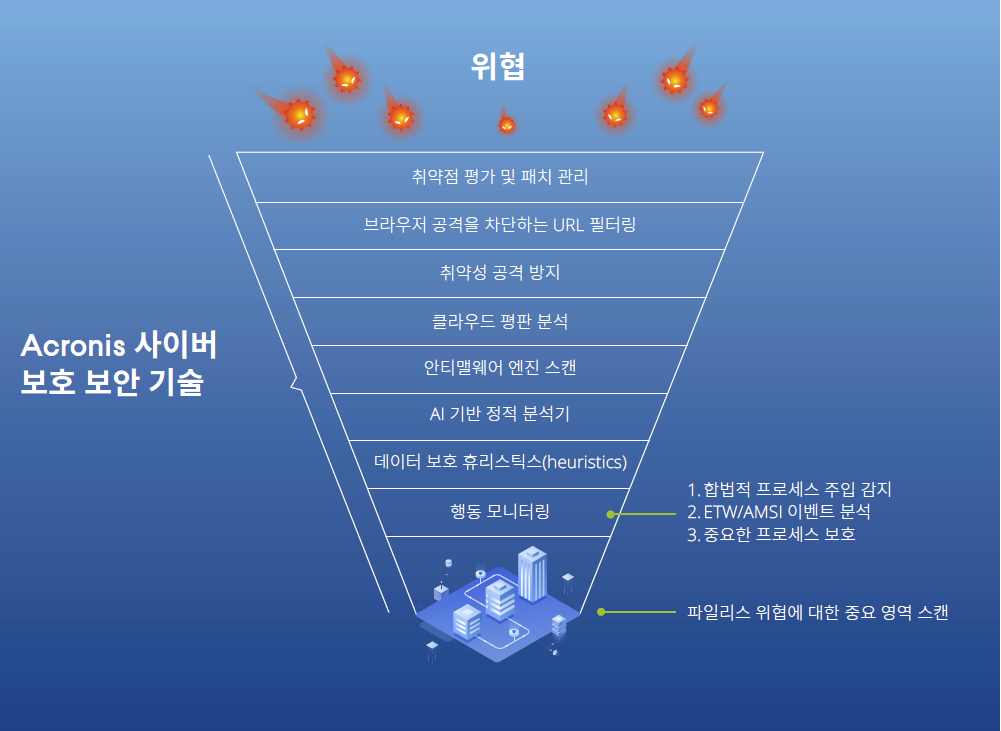 이런 방식의 공격으로 사용자의 정보는 해커의 서버로 전송되지만 악성코드의 흔적은 찾을 수 없게 됩니다. Acronis Cyber Protect는 어떻게 파일리스 공격을 차단할까요? 최신 사이버 보안 솔루션에 기대하듯이 Acronis Cyber Protect는 아래 같은 다계층 접근 방식을 통해 파일리스를 감지하고 차단합니다. 1. PowerShell 및 기타 애플리케이션 모니터링 2. AI 기반 정적 분석 3. 내장된 취약점 평가 및 패치 관리 활용 4. 신뢰할 수 있는 프로세스 분석