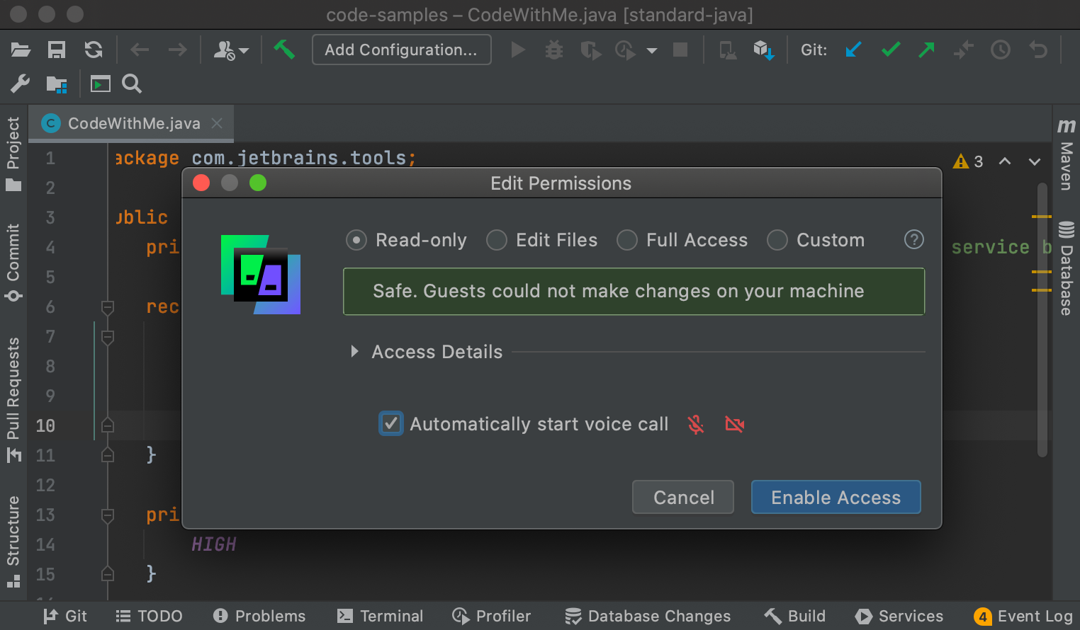 풍부한 스마트 기능 ■ Blurred background(흐린 배경): 동영상 피드의 배경에 보이는 것을 제어할 수 있는 기능으로 베타 버전에서 기본적으로 제공되는 설정입니다. Code With Me 베타 출시 1. 호스트와 게스트가 액세스할 수 있는 기능 및 작업 전체 목록. 여기에 더해 최근 실제 사용 사례를 공유하고자 합니다. 인기 있는 오픈 소스 프로젝트를 오랜 기간 관리해온 Steve Piercy가 Code With Me를 사용하여 프로젝트 문서에 기여하는 방법을 안내하는 이 웨비나를 확인하세요. 여기까지 Code With Me의 영상 및 음성 통화 기능에 대한 설명이었습니다. 긴 글 읽어주셔서 감사합니다. 이 게시물은 Ekaterina Kalinina가 작성한 Code With Me Beta: Support for Audio and Video Calls를 번역한 글입니다. |