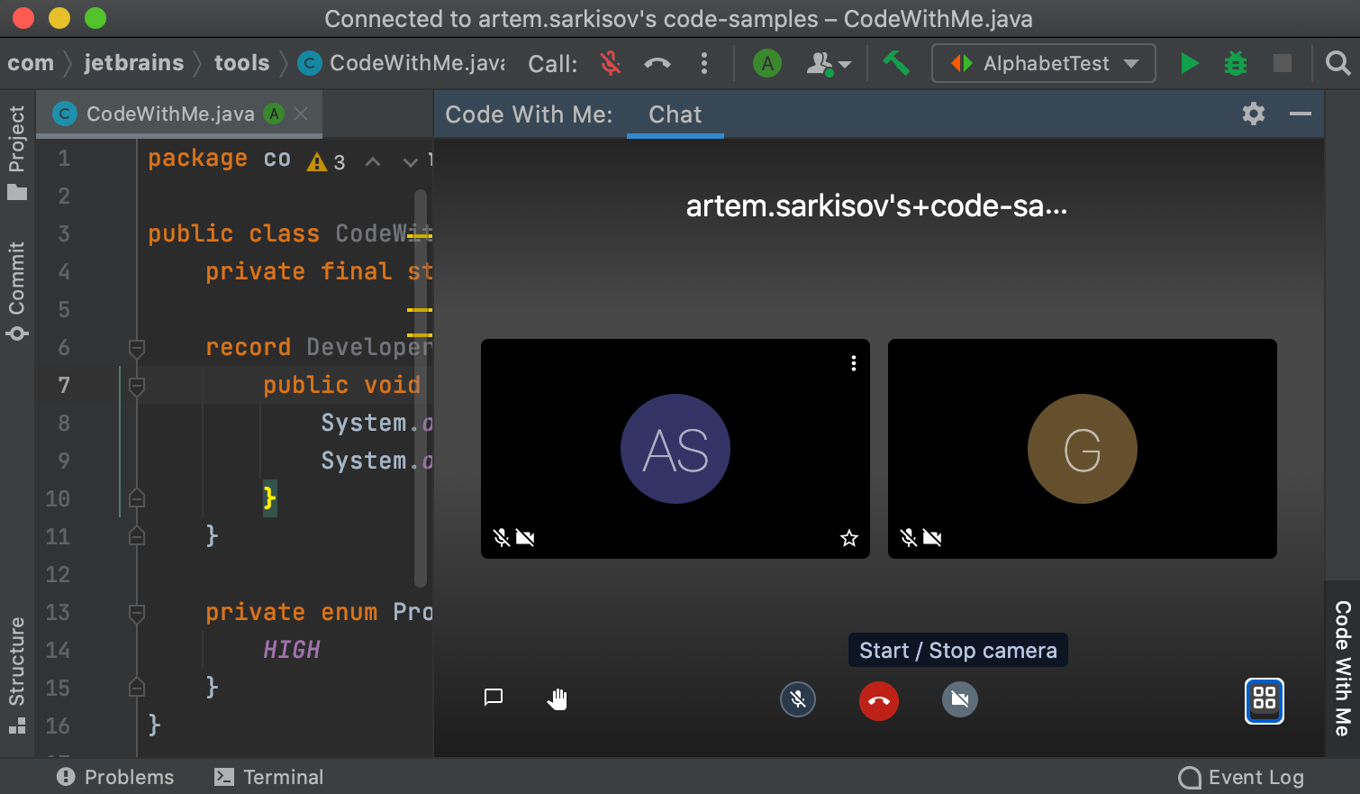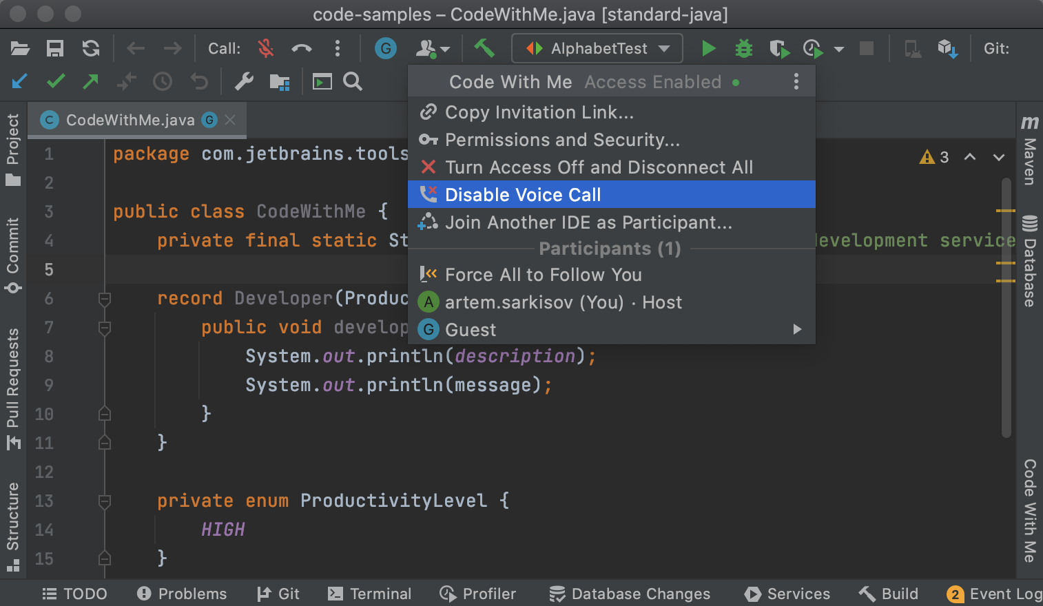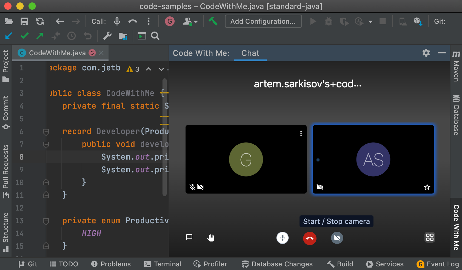 ② 동료와의 공동 코딩 세션 중 언제든지 통화를 시작할 수 있습니다. 통화를 시작하려면 오른쪽 하단에 있는 Code With Me 도구 창을 열어 통화 및 채팅 창에 액세스합니다.