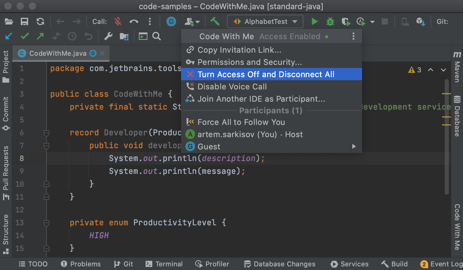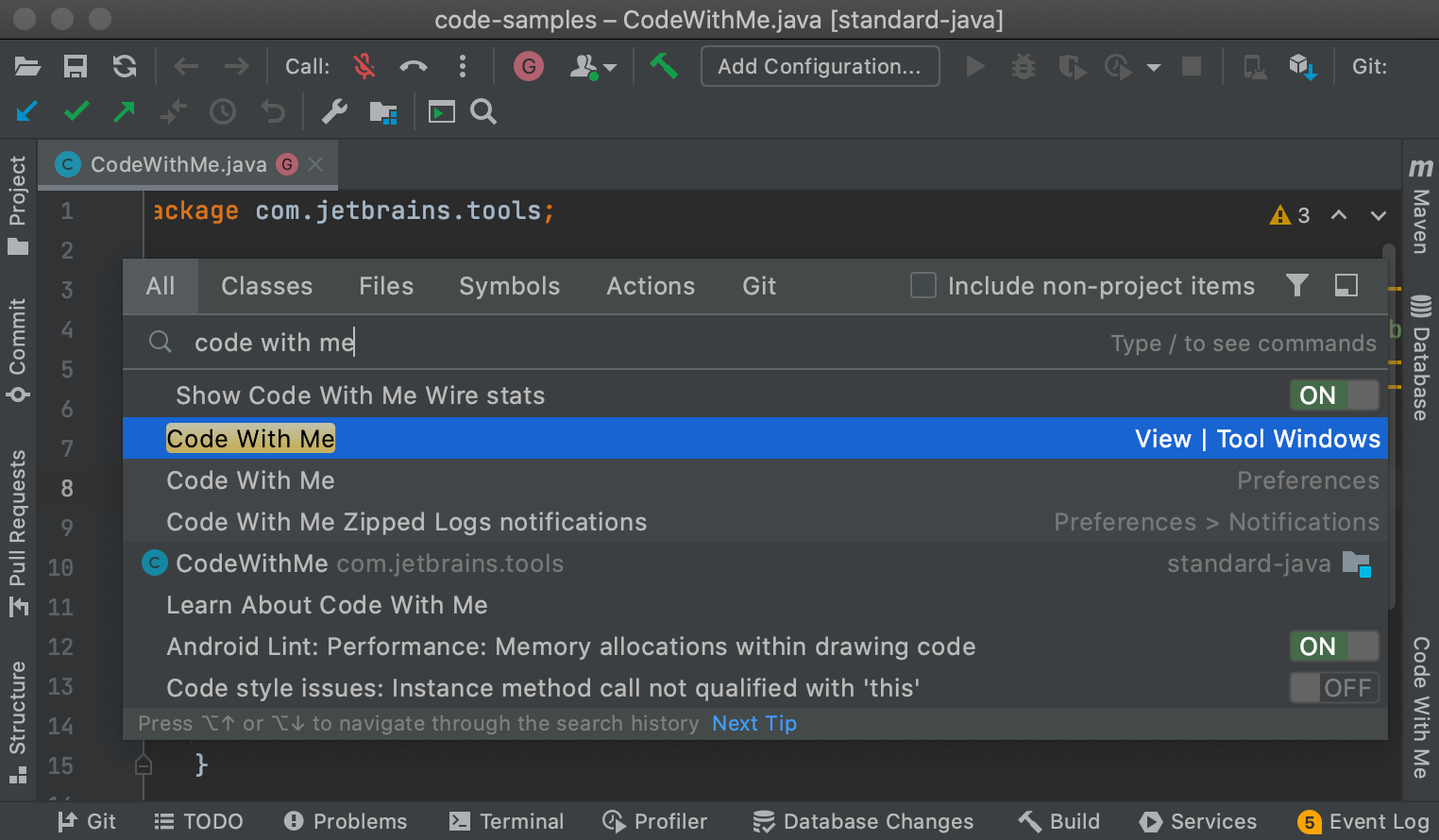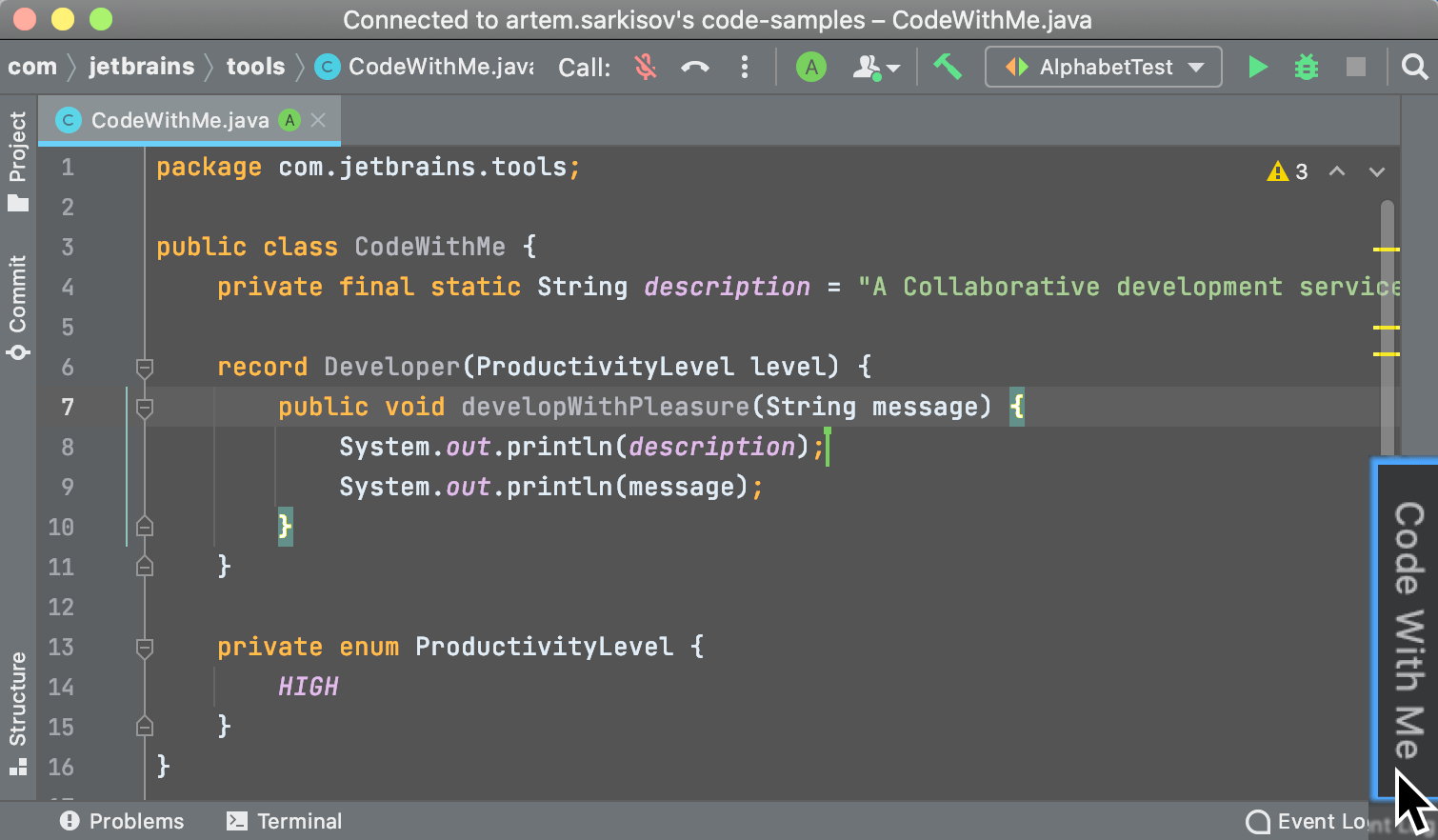 ② 동료와의 공동 코딩 세션 중 언제든지 통화를 시작할 수 있습니다. 통화를 시작하려면 오른쪽 하단에 있는 Code With Me 도구 창을 열어 통화 및 채팅 창에 액세스합니다.