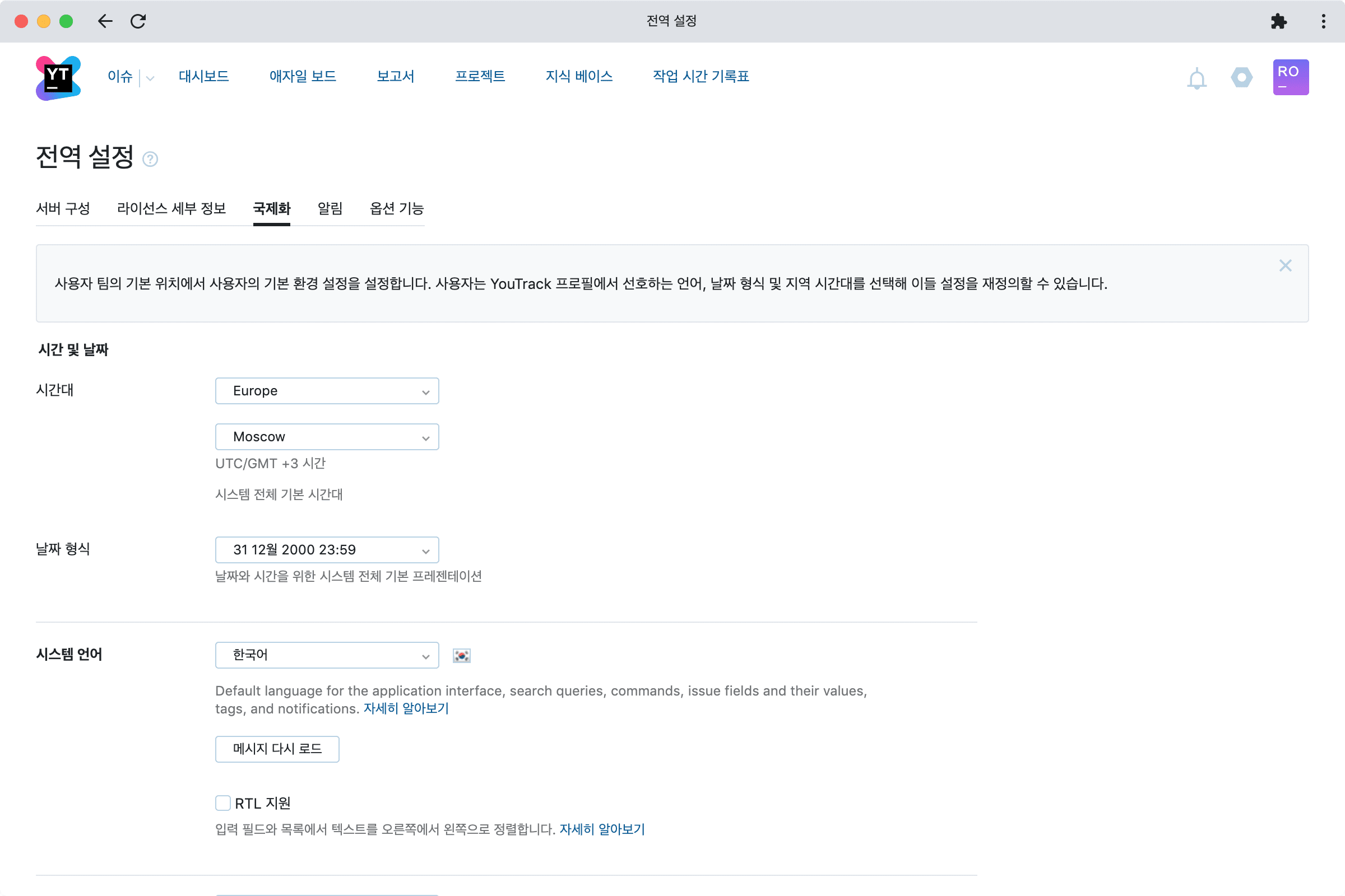 2. 관리자는 Internationalization(국제화) 탭의 Server Settings(서버 설정) > Global Settings(전역 설정)에서 YouTrack 시스템 언어를 변경할 수 있습니다.