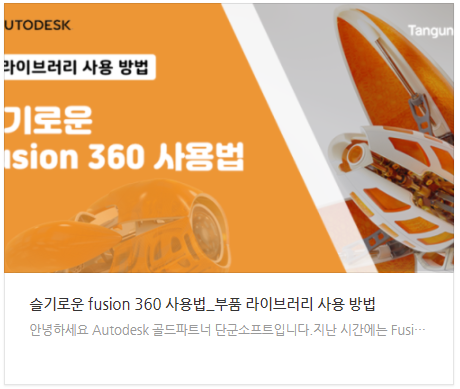 안녕하세요 Autodesk 골드파트너 단군소프트입니다. 지난 시간에 알려드린 Fusion 360 ‘부품 라이브러리 사용 방법’, 사용해 보셨나요? Fusion 360의 부품 라이브러리는 로컬 환경에서 파일을 불러오는 것이 아니라 PC 용량에 부담을 주지 않고 언제든지 사용할 수 있습니다. 혹시 지난 포스팅을 아직 보지 못하신 분들은 아래 링크에서 확인하세요!!