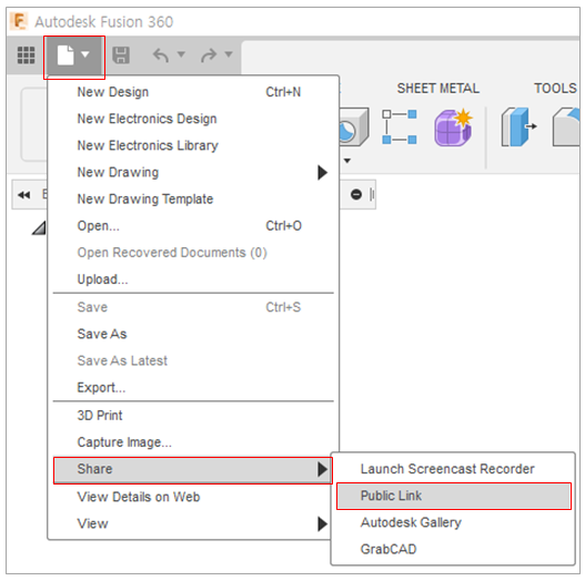 ① Fusion 360에서 저장된 데이터를 불러온 후 [File – Share – Public Link]를 클릭합니다.