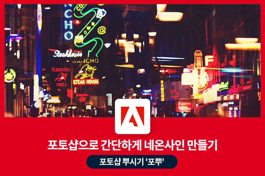 안녕하세요, 어도비 플래티넘 파트너 단군소프트입니다. 오늘은 포토샵 뿌시기 '포뿌' 시리즈의 첫 시작! ‘포토샵으로 간단하게 네온사인 만들기’에 대해 다뤄보려고 합니다. 요즘 식당 혹은 예쁜 카페들을 가보면 치명적인 문구로 예쁜 네온사인이 걸려 있거나, 우리가 보는 미드에서는 간판을 네온으로 사용한 걸 볼 수 있습니다. 왜인지 모르게 네온을 볼 때마다 감성에 젖곤 하는데요, 그래서 오늘은 직접 그 네온사인을 포토샵으로 만들어 보려고 합니다!