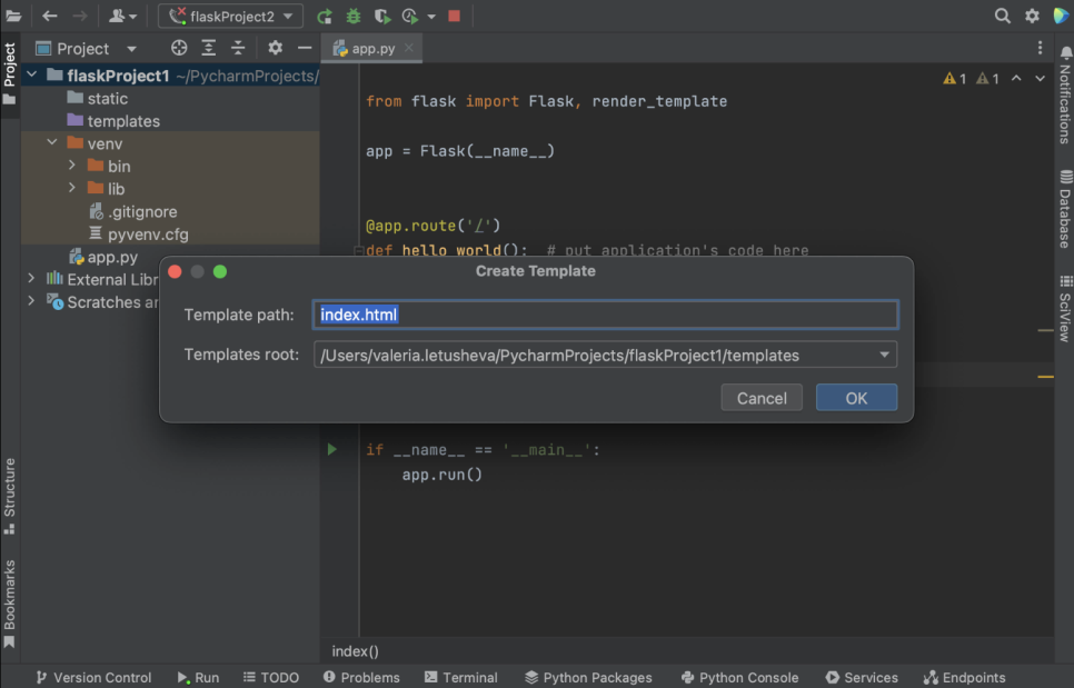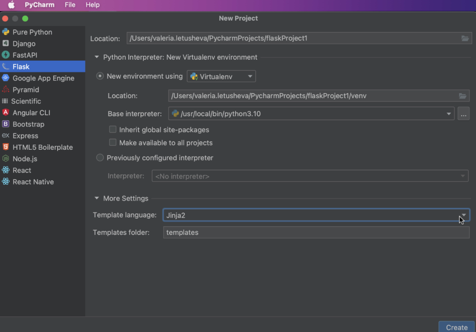 이제 새로운 Flask 프로젝트를 시작할 준비가 되었습니다! 대화상자의 오른쪽 하단 모서리에 있는 ‘Create'(생성) 버튼을 잊지 말고 클릭하세요. PyCharm은 특정 디렉터리 구조와 전용 템플릿 폴더가 자동으로 적용된 Flask 애플리케이션을 만들고 아직 설치되어 있지 않은 경우 시스템에 Flask를 설치합니다.