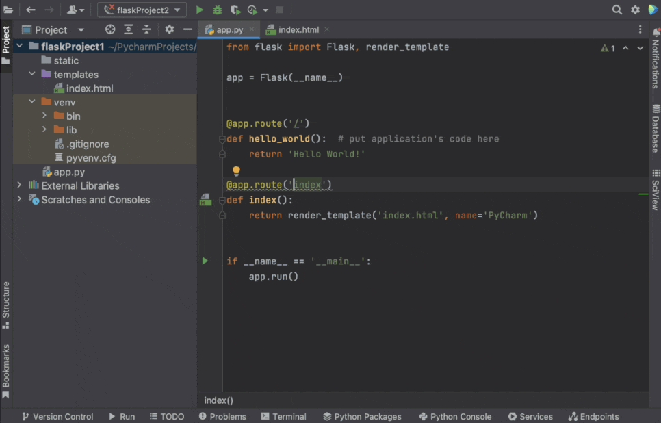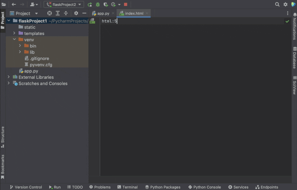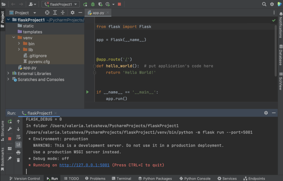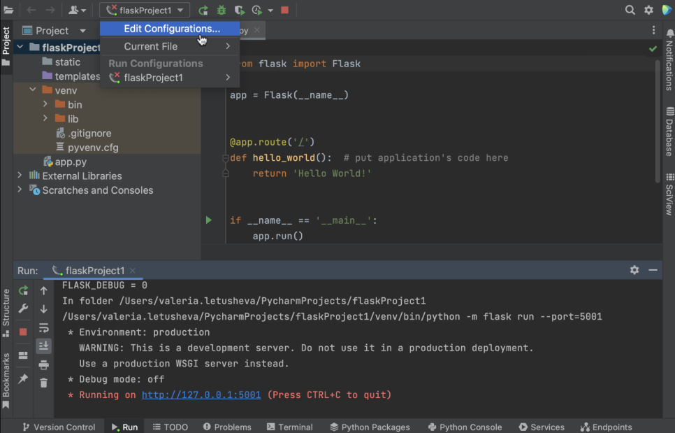새 Flask 애플리케이션이 PyCharm에 의해 미리 구성되면 애플리케이션이 제대로 작동하고 설정이 올바른지 테스트하는 데 사용할 수 있는 스텁 Python 스크립트인 app.py 파일이 열린 상태로 표시됩니다.