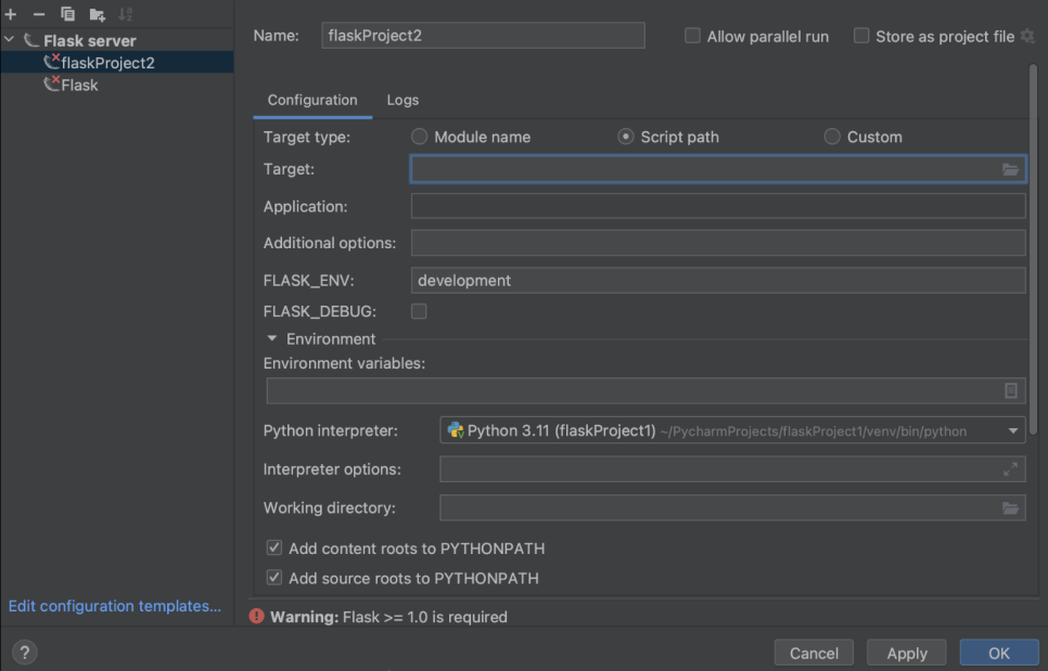 두 경우 모두 New Project 대화상자로 이동하여, 여기에 있는 왼쪽 패널의 프로젝트 유형 목록에서 Flask를 선택할 수 있습니다.