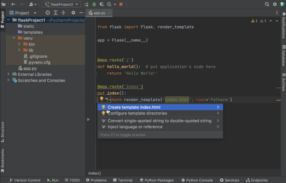 템플릿 사용하기 사용 위치에서 템플릿 파일을 만드는 방법 Flask 지원의 일부로 PyCharm은 코드 작업 중에 템플릿 파일을 자동으로 생성하는 기능을 제공합니다. 따라서 경로에 없는 템플릿을 언급하면 PyCharm이 템플릿 파일의 이름을 강조 표시합니다. 강조 표시된 템플릿 이름에 캐럿을 놓고 빠른 수정 Create template(템플릿 생성)