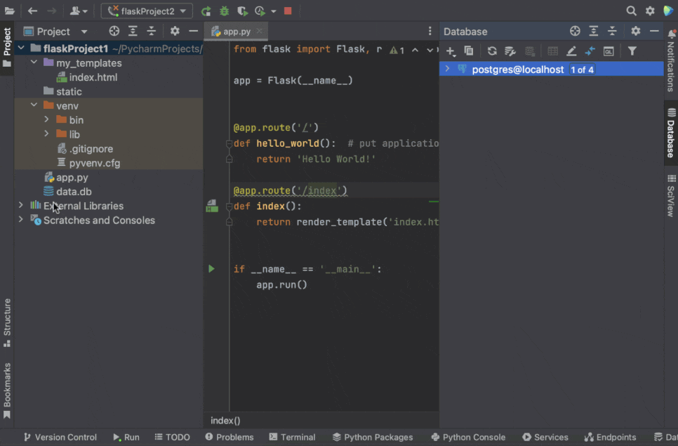 데이터베이스를 프로젝트와 연결하면 SQL 구문과 전체 프로젝트에 대한 적절한 코드 정보를 얻을 수 있습니다. PyCharm은 연결된 데이터베이스를 포함하여 전체 프로젝트를 내부 검사할 수 있으며 코드에서 데이터베이스의 테이블 이름이 필요할 때 이를 인식합니다. 이제 새로운 Flask 애플리케이션에서 생산적으로 작업할 모든 준비를 마쳤습니다. 추가적인 질문이 있으시다면 댓글을 남겨주세요.